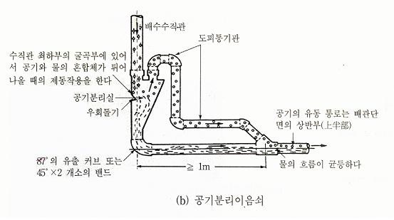공기혼합이음쇠에 의해 수직관 상부의 배수와 공기는 수평지관에서 유입하는 배수에 영향을 받지 않고 낙하하며, 혼합실에서 공기와 배수가 잘 혼합되어 비중이 가벼운 배수가 된다. 또한 각 층의 S자형 오프셋(off-set)부 저항에 의해 수직관내의 유하속도(流下速度)가 감속되어 기압변동을 감소시킨다. 수직관을 유하한 공기와 배수의 혼합체는 공기분리이음쇠의 돌기부에서 분리되며, 공기는 도피통기관을 통해 배수수평주관으로 유도된다.