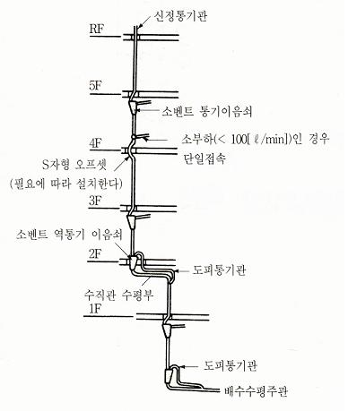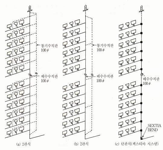 이들 방식은 주로 유럽에서 발달한 방식으로서, 각개통기관 또는 루프통기관을 설치하지 않기 때문에 자기사이펀 작용 등의 염려가 있으므로 충분한 검토 후에 채택하는 것이 바람직하다. 건물 각층의 평면이 거의 같고, 배수수직관으로부터 비교적 짧은 거리에 기구를 설치하는 공동주택이나 호텔 등에 많이 채택되고 있다.