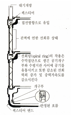 섹스티어 이음쇠는 내부에 고정날개(배플 판)를 설치하여 배수수평지관에서 수직관으로 흐르는 배수에 제동을 걸면서 원심력을 일으키게 한다. 이 때 배수의 흐름은 입관 내벽에 밀어 붙여져 얇은 수막 층을 형성시키고 수직관의 중심부에 생긴 공기코어의 주위를 선회하면서 유하한다. 또한 섹스티어 곡관은 내면에 디플렉터(deflector)를 설치하여, 수직관을 낙하해 온 배수흐름에 선회력을 주어 배수수평주관에 공기코어를 연장하도록 하였다.